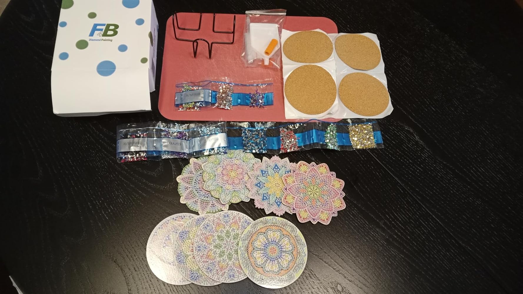 Precioso juego de posavasos con bonitos diseños con motivos indios. Muy entretenida manualidad, aunque es algo que requiere paciencia puesto que se puede tardar aproximadamente entre 3 y 4 horas cada posavasos. El resultado resulta muy vistoso, los mini diamantes de colores brillan de forman espectacular, tanto con luz natural como artificial, según el ángulo con el que incida la luz y la posición del observador. El kit es bastante completo, aunque si te interesa esta manualidad yo aconsejaría contar con algún tipo de envase para guardar organizados por colores los diamantes de las bolsas abiertas. Además, es necesario disponer de unas pinzas para manipular los diamantes en caso de error, y barniz para dar una capa final; en nuestro caso hemos empleado un barniz en spray. Estas dos últimas cosas son imprescindibles, pero no se incluyen en el kit, por lo que le quito una estrella al producto. Hecha esta salvedad, el producto nos ha gustado mucho y lo recomiendo si te gustan las manualidades y dispones de tiempo y paciencia.